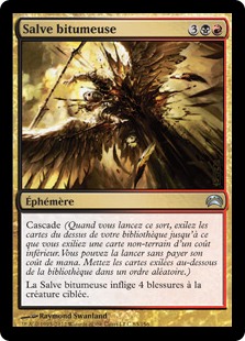 | Rules | Cascade (When you cast this spell, exile cards from the top of your library until you exile a nonland card that costs less. You may cast it without paying its mana cost. Put the exiled cards on the bottom of your library in a random order.) Bituminous Blast deals 4 damage to target creature. |