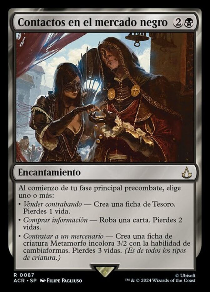 | Rules | At the beginning of your precombat main phase, choose one or more — • Sell Contraband — Create a Treasure token. You lose 1 life. • Buy Information — Draw a card. You lose 2 life. • Hire a Mercenary — Create a 3/2 colorless Shapeshifter creature token with changeling. You lose 3 life. (It has every creature type.) |