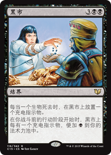 | Rules | Whenever a creature dies, put a charge counter on Black Market. At the beginning of your precombat main phase, add for each charge counter on Black Market. |
