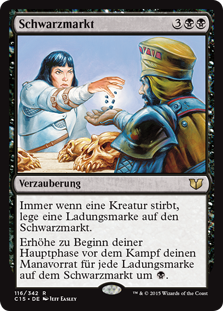 | Rules | Whenever a creature dies, put a charge counter on Black Market. At the beginning of your precombat main phase, add for each charge counter on Black Market. |