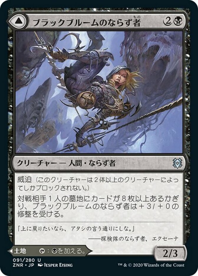 | Rules | Menace (This creature can't be blocked except by two or more creatures.) Blackbloom Rogue gets +3/+0 as long as an opponent has eight or more cards in their graveyard. // Blackbloom Bog enters the battlefield tapped. : Add . |