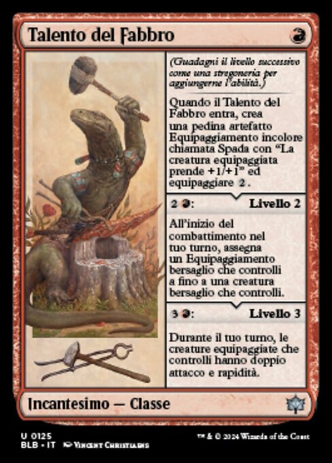 | Rules | (Gain the next level as a sorcery to add its ability.) When Blacksmith's Talent enters, create a colorless Equipment artifact token named Sword with "Equipped creature gets +1/+1" and equip . : Level 2 At the beginning of combat on your turn, attach target Equipment you control to up to one target creature you control. : Level 3 During your turn, equipped creatures you control have double strike and haste. |