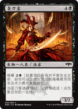 | Rules | Spectacle (You may cast this spell for its spectacle cost rather than its mana cost if an opponent lost life this turn.) When Blade Juggler enters the battlefield, it deals 1 damage to you and you draw a card. |