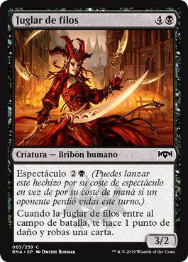 | Rules | Spectacle (You may cast this spell for its spectacle cost rather than its mana cost if an opponent lost life this turn.) When Blade Juggler enters the battlefield, it deals 1 damage to you and you draw a card. |