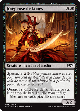 | Rules | Spectacle (You may cast this spell for its spectacle cost rather than its mana cost if an opponent lost life this turn.) When Blade Juggler enters the battlefield, it deals 1 damage to you and you draw a card. |