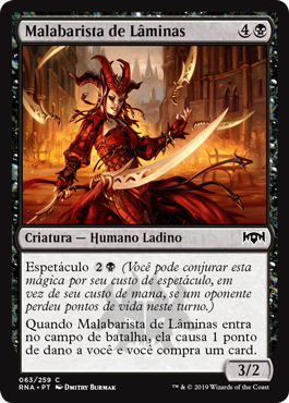 | Rules | Spectacle (You may cast this spell for its spectacle cost rather than its mana cost if an opponent lost life this turn.) When Blade Juggler enters the battlefield, it deals 1 damage to you and you draw a card. |