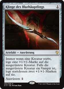 | Rules | Whenever a creature dies, put a +1/+1 counter on equipped creature. If equipped creature is a Vampire, put two +1/+1 counters on it instead. Equip |