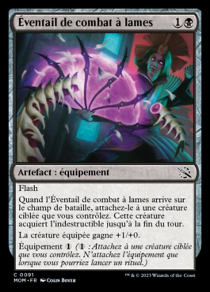 | Rules | Flash When Bladed Battle-Fan enters the battlefield, attach it to target creature you control. That creature gains indestructible until end of turn. Equipped creature gets +1/+0. Equip ( : Attach to target creature you control. Equip only as a sorcery.) |