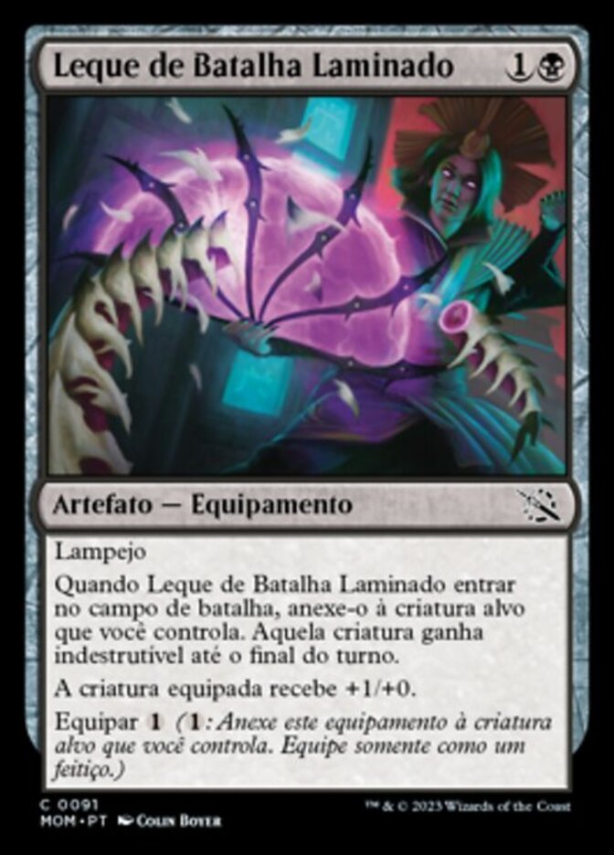 | Rules | Flash When Bladed Battle-Fan enters the battlefield, attach it to target creature you control. That creature gains indestructible until end of turn. Equipped creature gets +1/+0. Equip ( : Attach to target creature you control. Equip only as a sorcery.) |