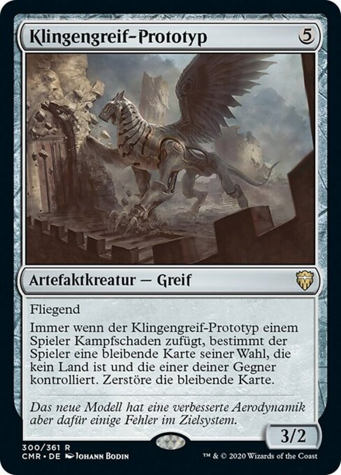 | Rules | Flying Whenever Bladegriff Prototype deals combat damage to a player, destroy target nonland permanent of that player's choice that one of your opponents controls. |