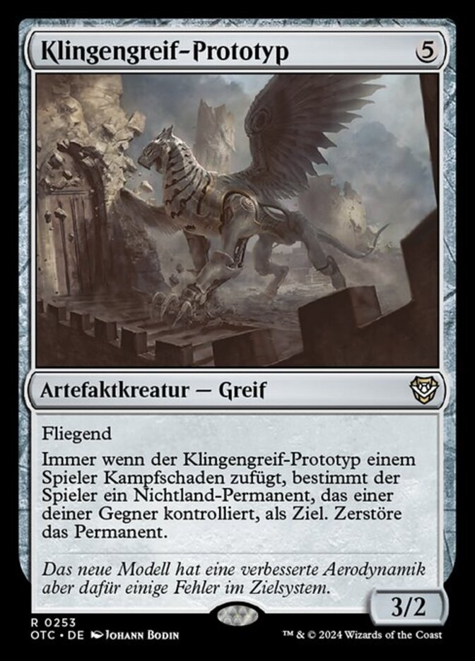 | Rules | Flying Whenever Bladegriff Prototype deals combat damage to a player, destroy target nonland permanent of that player's choice that one of your opponents controls. |