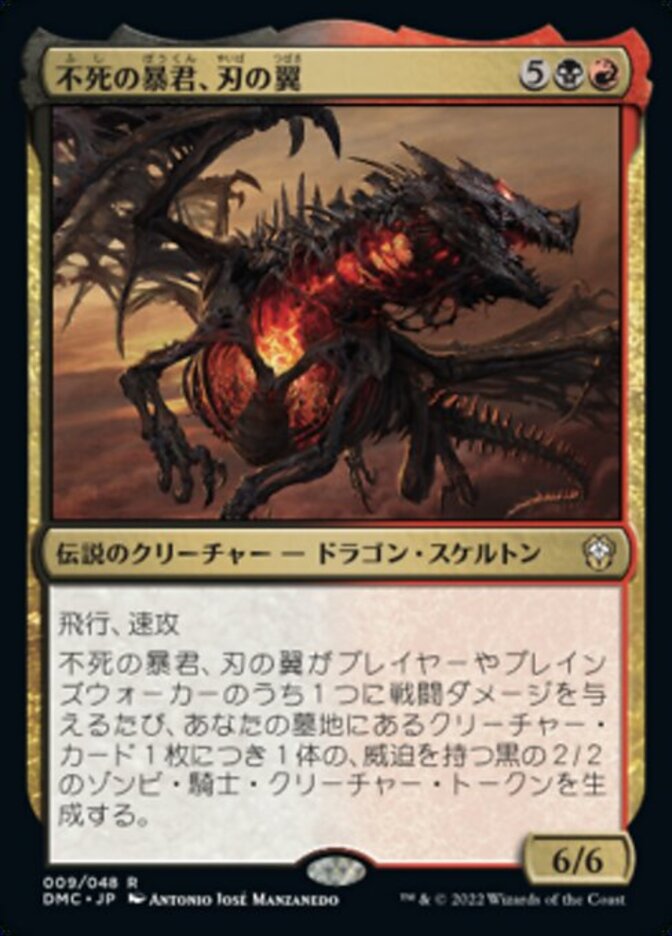 | Rules | Flying, haste Whenever Bladewing, Deathless Tyrant deals combat damage to a player or planeswalker, for each creature card in your graveyard, create a 2/2 black Zombie Knight creature token with menace. |