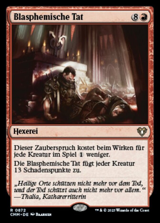 | Rules | This spell costs less to cast for each creature on the battlefield. Blasphemous Act deals 13 damage to each creature. |