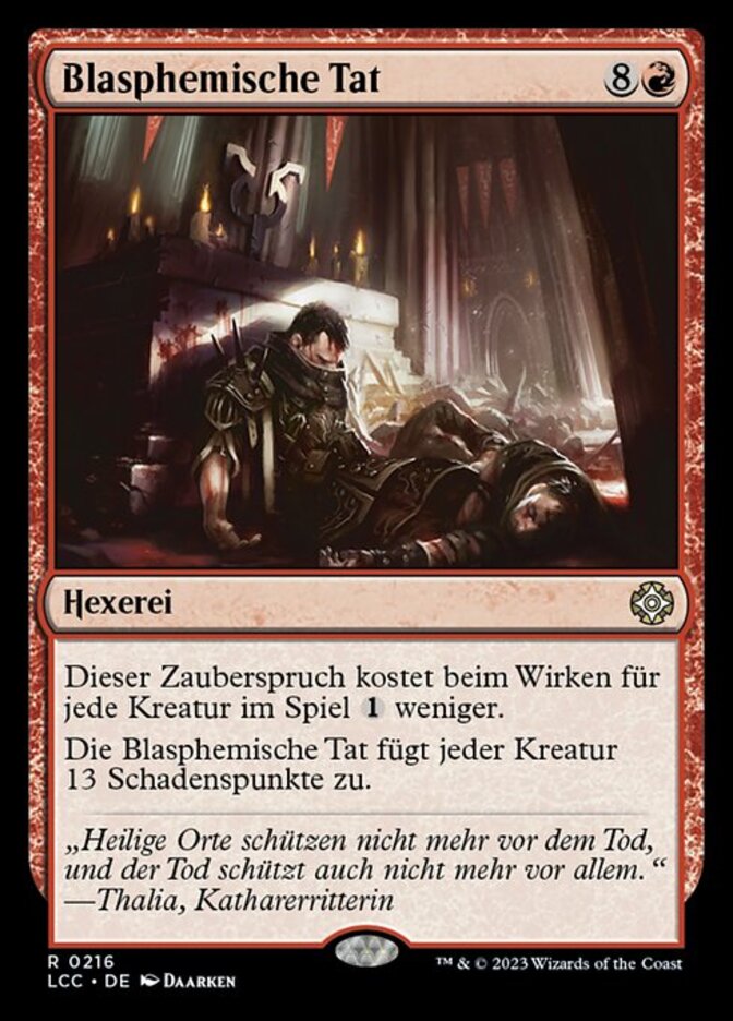| Rules | This spell costs less to cast for each creature on the battlefield. Blasphemous Act deals 13 damage to each creature. |
