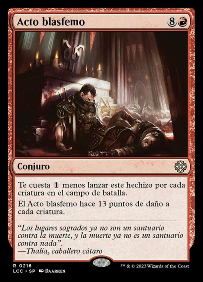 | Rules | This spell costs less to cast for each creature on the battlefield. Blasphemous Act deals 13 damage to each creature. |