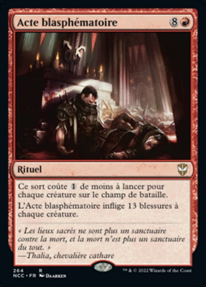 | Rules | This spell costs less to cast for each creature on the battlefield. Blasphemous Act deals 13 damage to each creature. |