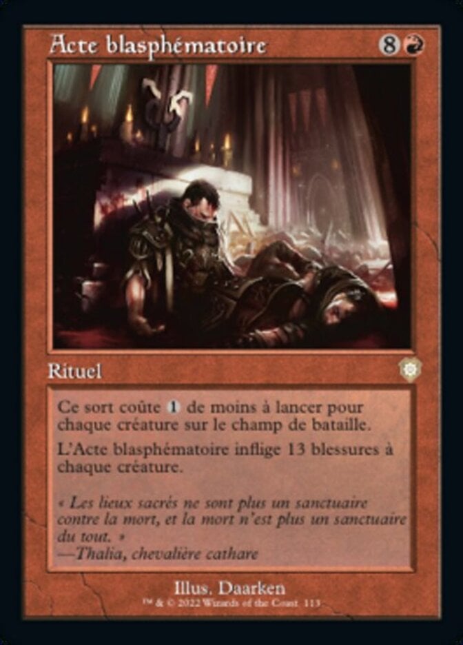 | Rules | This spell costs less to cast for each creature on the battlefield. Blasphemous Act deals 13 damage to each creature. |