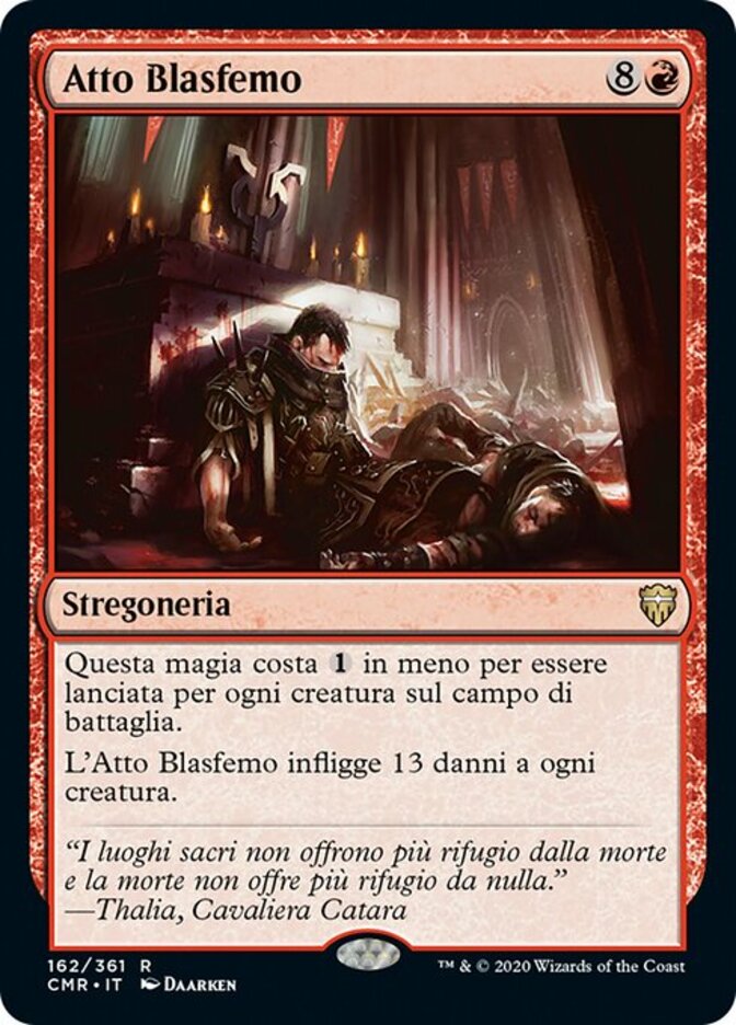 | Rules | This spell costs less to cast for each creature on the battlefield. Blasphemous Act deals 13 damage to each creature. |