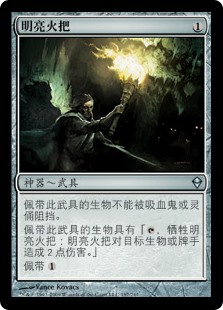 | Rules | Equipped creature can't be blocked by Vampires or Zombies. Equipped creature has ", Sacrifice Blazing Torch: Blazing Torch deals 2 damage to any target." Equip (: Attach to target creature you control. Equip only as a sorcery.) |