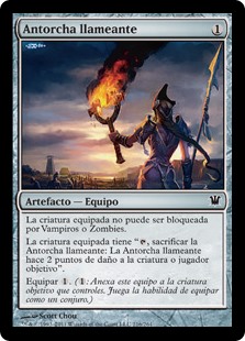 | Rules | Equipped creature can't be blocked by Vampires or Zombies. Equipped creature has ", Sacrifice Blazing Torch: Blazing Torch deals 2 damage to any target." Equip (: Attach to target creature you control. Equip only as a sorcery.) |