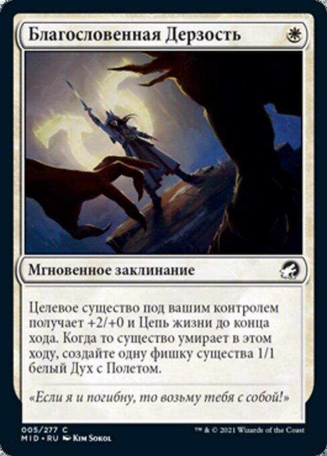 | Rules | Target creature you control gets +2/+0 and gains lifelink until end of turn. When that creature dies this turn, create a 1/1 white Spirit creature token with flying. |