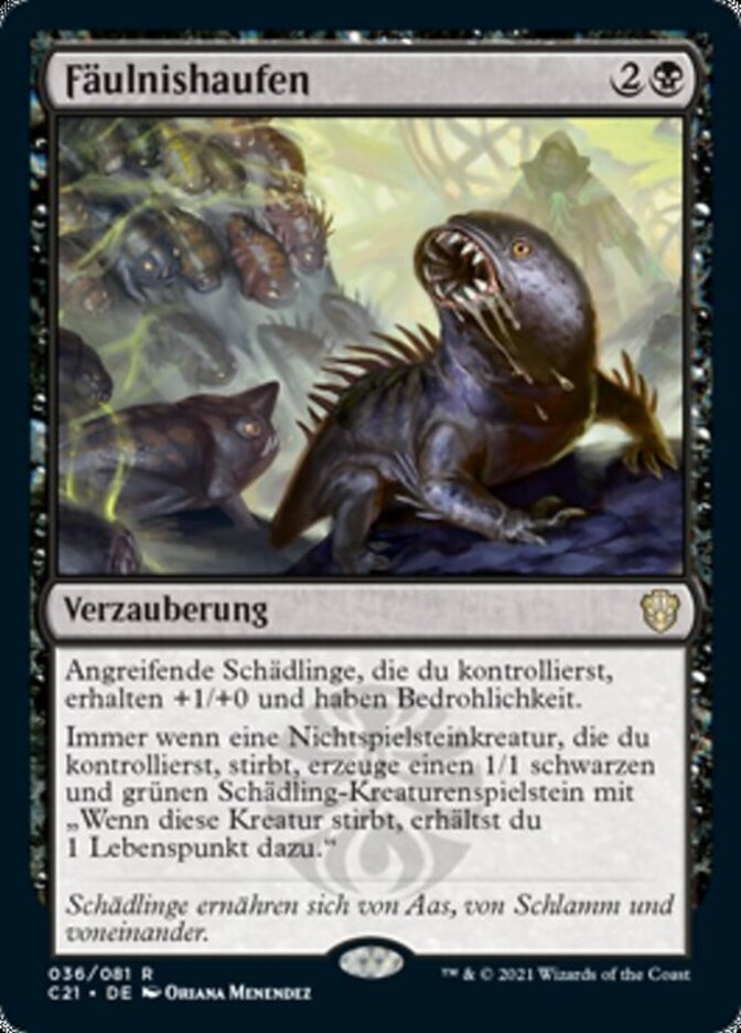 | Rules | Attacking Pests you control get +1/+0 and have menace. Whenever a nontoken creature you control dies, create a 1/1 black and green Pest creature token with "When this creature dies, you gain 1 life." |