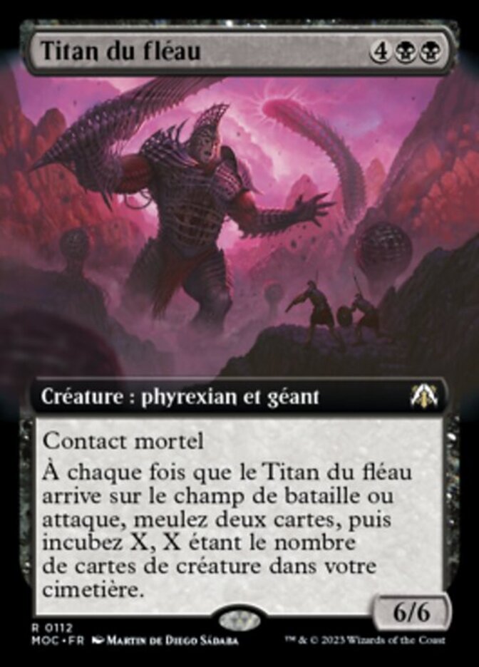 Whenever Blight Titan enters the battlefield or attacks, mill two cards, then incubate X, where X is the number of creature cards in your graveyard. (Create an Incubator token with X +1/+1 counters on it and ": Transform this artifact." It transforms into a 0/0 Phyrexian artifact creature.)