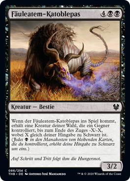 | Rules | When Blight-Breath Catoblepas enters the battlefield, target creature an opponent controls gets -X/-X until end of turn, where X is your devotion to black. (Each in the mana costs of permanents you control counts toward your devotion to black.) |