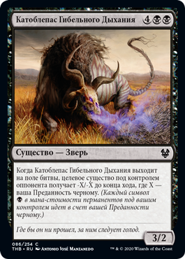 Rules When Blight-Breath Catoblepas enters the battlefield, target creature an opponent controls gets -X/-X until end of turn, where X is your devotion to black. (Each in the mana costs of permanents you control counts toward your devotion to black.)