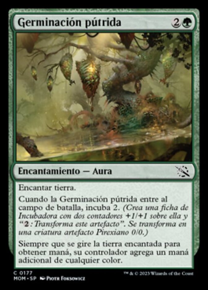 | Rules | Enchant land When Blighted Burgeoning enters the battlefield, incubate 2. (Create an Incubator token with two +1/+1 counters on it and ": Transform this artifact." It transforms into a 0/0 Phyrexian artifact creature.) Whenever enchanted land is tapped for mana, its controller adds an additional one mana of any color. |
