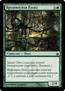 | Rules | Reach (This creature can block creatures with flying.) Infect (This creature deals damage to creatures in the form of -1/-1 counters and to players in the form of poison counters.) |