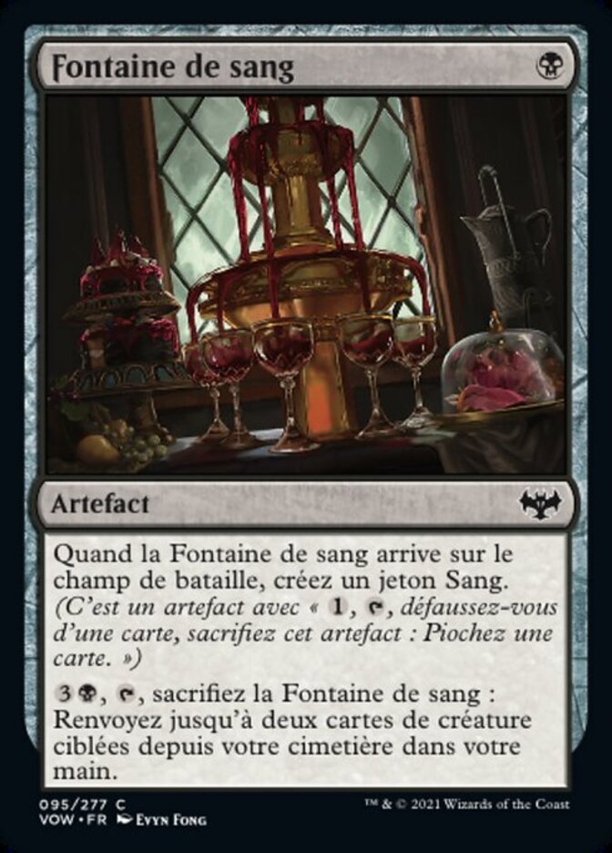 | Rules | When Blood Fountain enters the battlefield, create a Blood token. (It's an artifact with ", , Discard a card, Sacrifice this artifact: Draw a card.") , , Sacrifice Blood Fountain: Return up to two target creature cards from your graveyard to your hand. |