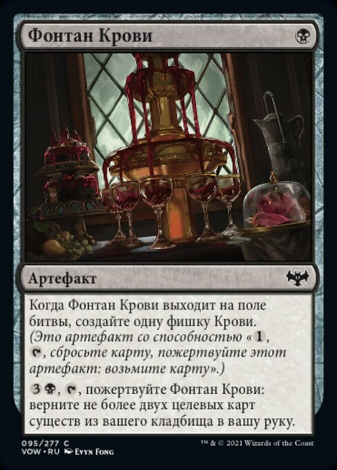 | Rules | When Blood Fountain enters the battlefield, create a Blood token. (It's an artifact with ", , Discard a card, Sacrifice this artifact: Draw a card.") , , Sacrifice Blood Fountain: Return up to two target creature cards from your graveyard to your hand. |
