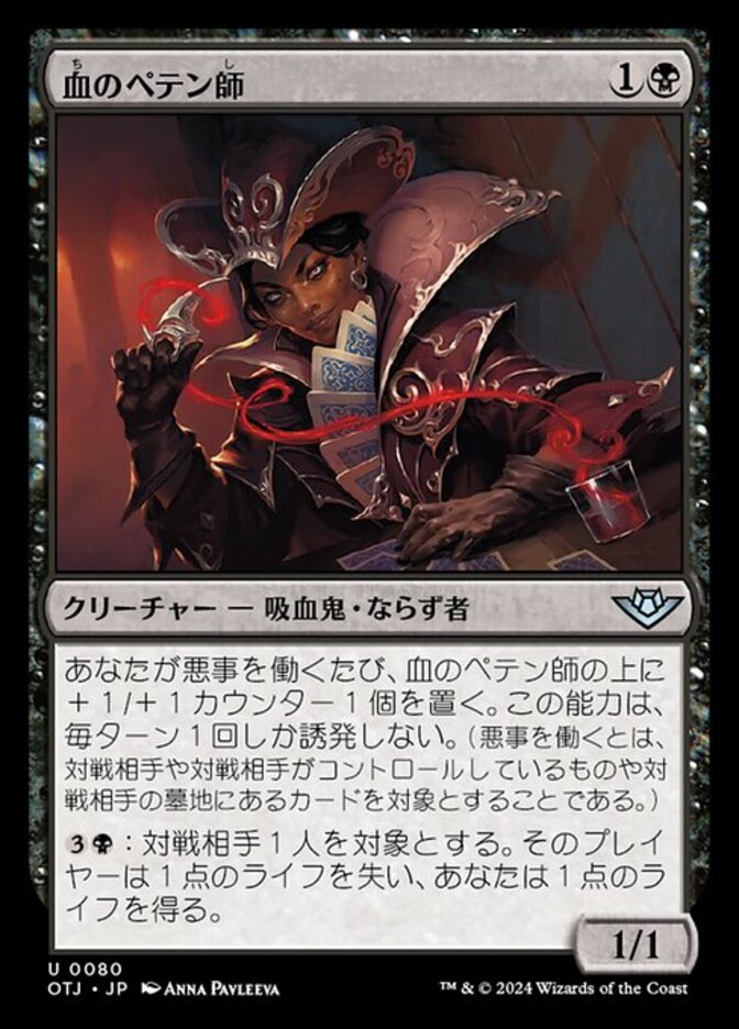 | Rules | Whenever you commit a crime, put a +1/+1 counter on Blood Hustler. This ability triggers only once each turn. (Targeting opponents, anything they control, and/or cards in their graveyards is a crime.) : Target opponent loses 1 life and you gain 1 life. |
