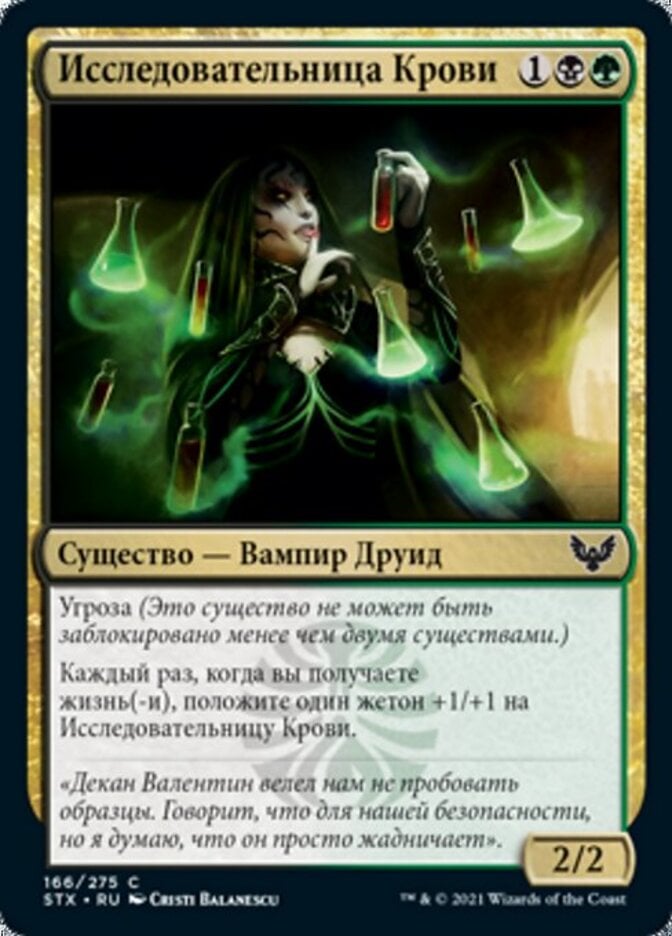 | Rules | Menace (This creature can't be blocked except by two or more creatures.) Whenever you gain life, put a +1/+1 counter on Blood Researcher. |