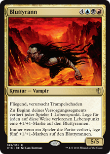 | Rules | Flying, trample At the beginning of your upkeep, each player loses 1 life. Put a +1/+1 counter on Blood Tyrant for each 1 life lost this way. Whenever a player loses the game, put five +1/+1 counters on Blood Tyrant. |