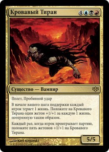 | Rules | Flying, trample At the beginning of your upkeep, each player loses 1 life. Put a +1/+1 counter on Blood Tyrant for each 1 life lost this way. Whenever a player loses the game, put five +1/+1 counters on Blood Tyrant. |