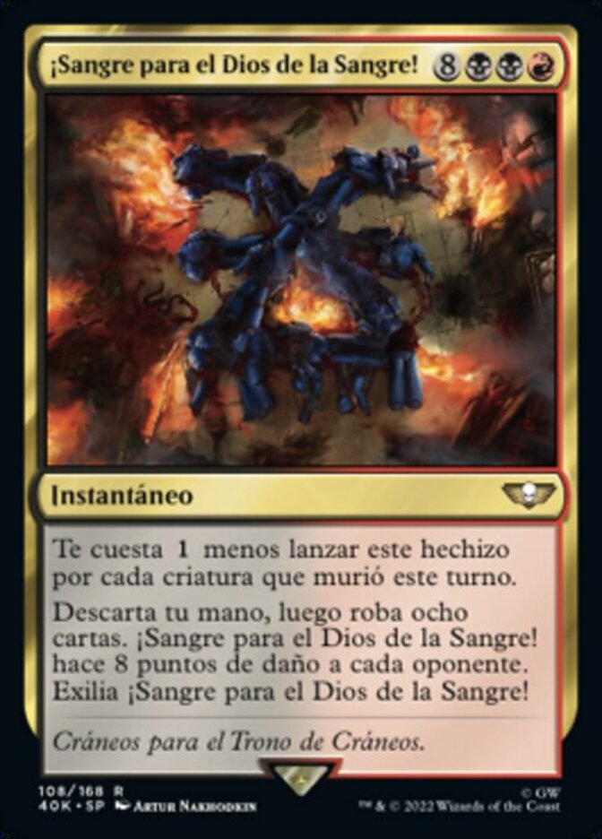 | Rules | This spell costs less to cast for each creature that died this turn. Discard your hand, then draw eight cards. Blood for the Blood God! deals 8 damage to each opponent. Exile Blood for the Blood God! |