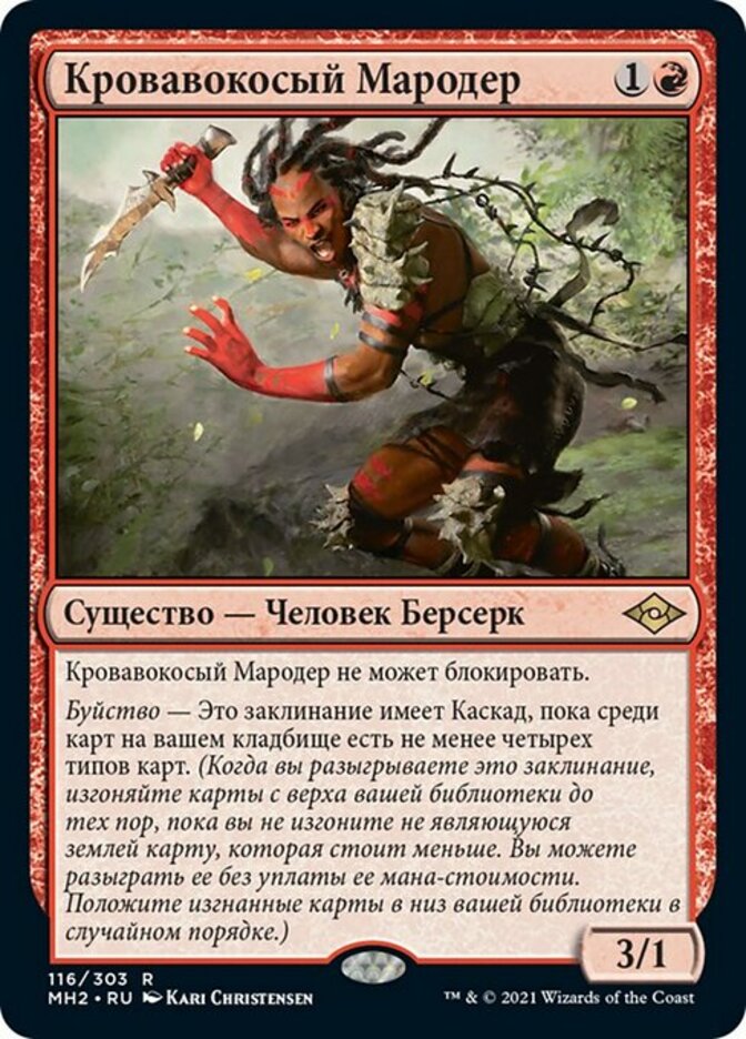 | Rules | Bloodbraid Marauder can't block. Delirium — This spell has cascade as long as there are four or more card types among cards in your graveyard. (When you cast this spell, exile cards from the top of your library until you exile a nonland card that costs less. You may cast it without paying its mana cost. Put the exiled cards on the bottom of your library in a random order.) |