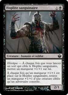 | Rules | Heroic — Whenever you cast a spell that targets Bloodcrazed Hoplite, put a +1/+1 counter on it. Whenever a +1/+1 counter is put on Bloodcrazed Hoplite, remove a +1/+1 counter from target creature an opponent controls. |