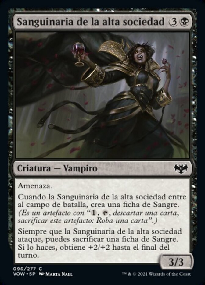 | Rules | Menace When Bloodcrazed Socialite enters the battlefield, create a Blood token. (It's an artifact with ", , Discard a card, Sacrifice this artifact: Draw a card.") Whenever Bloodcrazed Socialite attacks, you may sacrifice a Blood token. If you do, it gets +2/+2 until end of turn. |