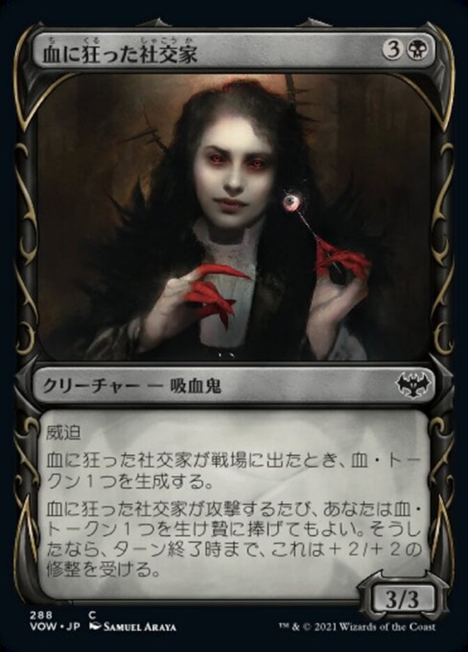| Rules | Menace When Bloodcrazed Socialite enters the battlefield, create a Blood token. (It's an artifact with ", , Discard a card, Sacrifice this artifact: Draw a card.") Whenever Bloodcrazed Socialite attacks, you may sacrifice a Blood token. If you do, it gets +2/+2 until end of turn. |