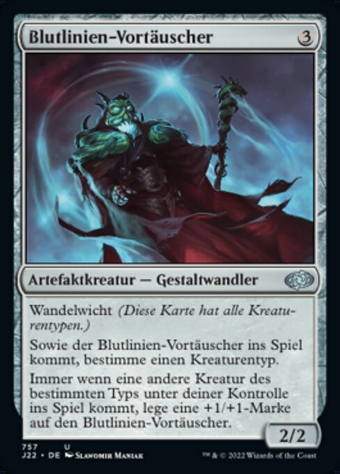 | Rules | Changeling (This card is every creature type.) As Bloodline Pretender enters the battlefield, choose a creature type. Whenever another creature of the chosen type enters the battlefield under your control, put a +1/+1 counter on Bloodline Pretender. |