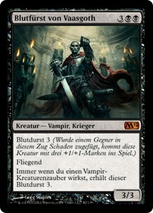 | Rules | Bloodthirst 3 (If an opponent was dealt damage this turn, this creature enters the battlefield with three +1/+1 counters on it.) Flying Whenever you cast a Vampire creature spell, it gains bloodthirst 3. |