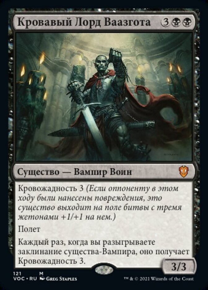 | Rules | Bloodthirst 3 (If an opponent was dealt damage this turn, this creature enters the battlefield with three +1/+1 counters on it.) Flying Whenever you cast a Vampire creature spell, it gains bloodthirst 3. |