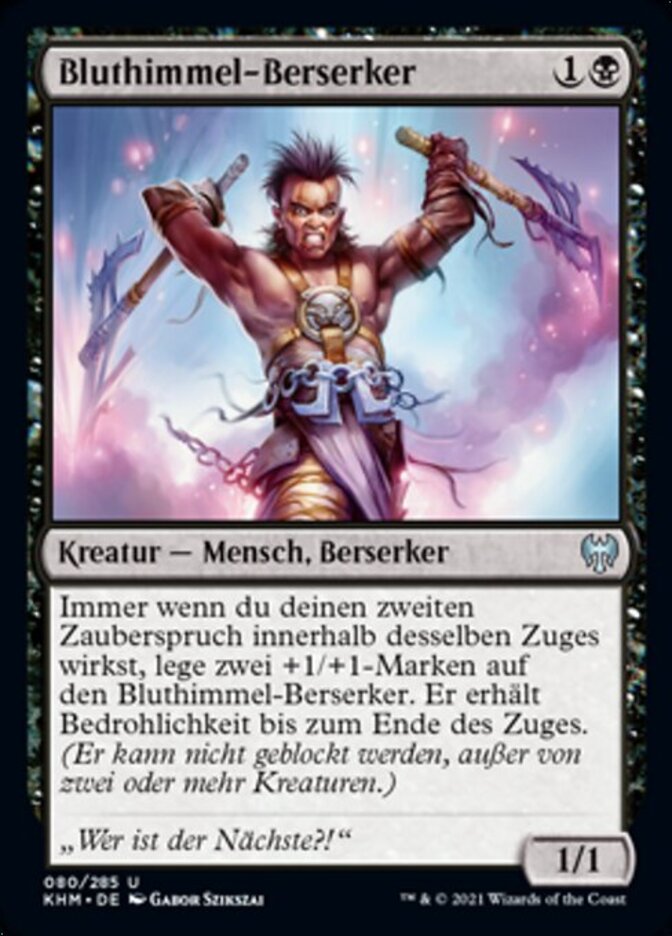 Rules Whenever you cast your second spell each turn, put two +1/+1 counters on Bloodsky Berserker. It gains menace until end of turn. (It can't be blocked except by two or more creatures.)