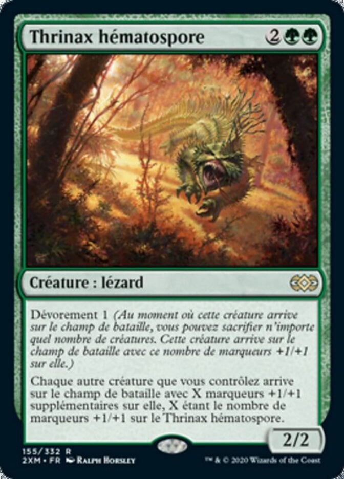 | Rules | Devour 1 (As this enters the battlefield, you may sacrifice any number of creatures. This creature enters the battlefield with that many +1/+1 counters on it.) Each other creature you control enters the battlefield with an additional X +1/+1 counters on it, where X is the number of +1/+1 counters on Bloodspore Thrinax. |