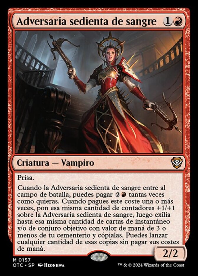 | Rules | Haste When Bloodthirsty Adversary enters the battlefield, you may pay any number of times. When you pay this cost one or more times, put that many +1/+1 counters on Bloodthirsty Adversary, then exile up to that many target instant and/or sorcery cards with mana value 3 or less from your graveyard and copy them. You may cast any number of the copies without paying their mana costs. |