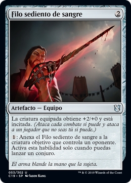 | Rules | Equipped creature gets +2/+0 and is goaded. (It attacks each combat if able and attacks a player other than you if able.) : Attach Bloodthirsty Blade to target creature an opponent controls. Activate only as a sorcery. |