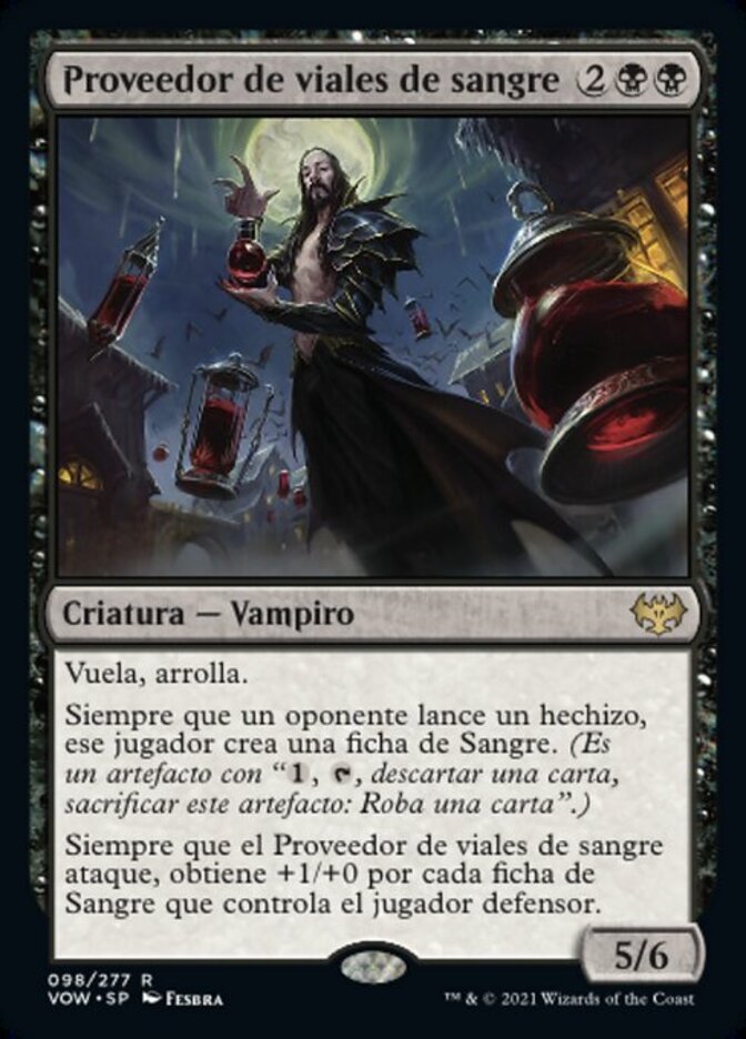 | Rules | Flying, trample Whenever an opponent casts a spell, that player creates a Blood token. (It's an artifact with ", , Discard a card, Sacrifice this artifact: Draw a card.") Whenever Bloodvial Purveyor attacks, it gets +1/+0 until end of turn for each Blood token defending player controls. |